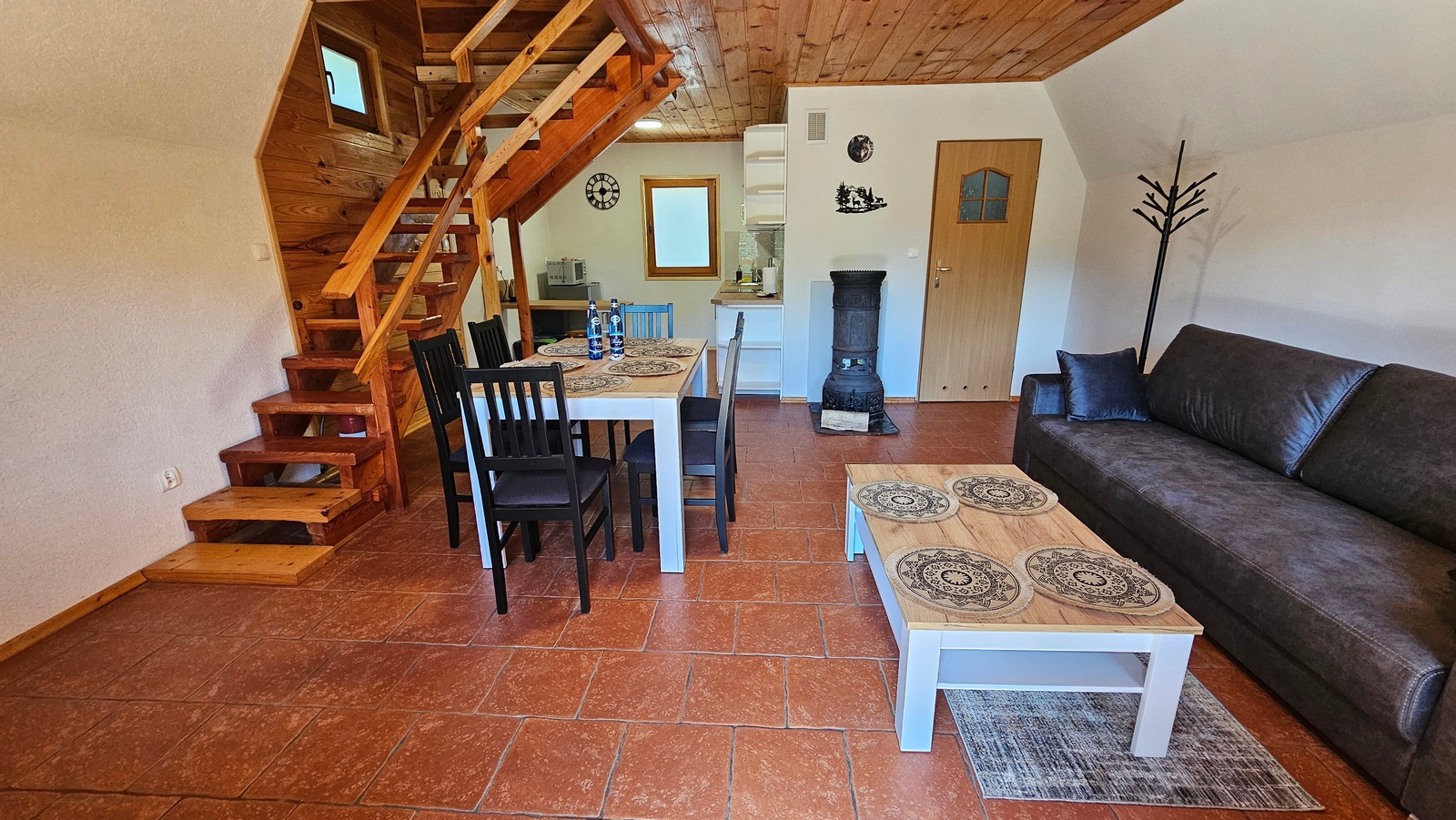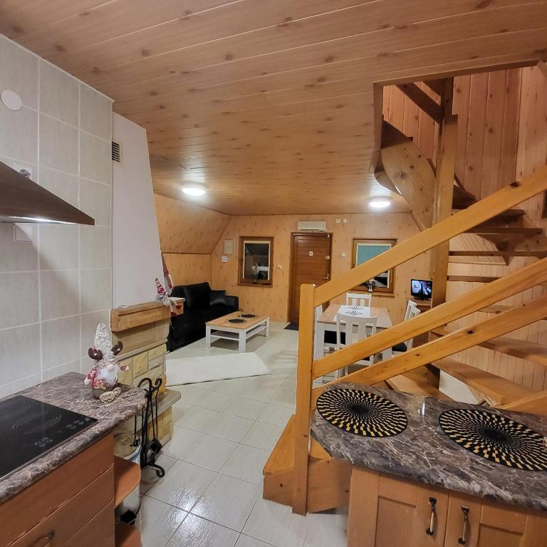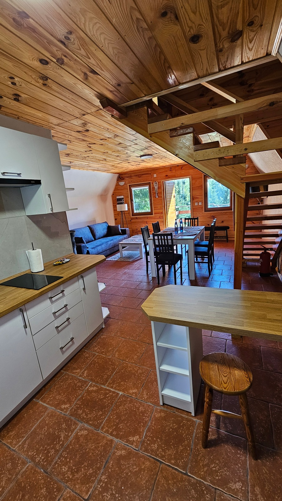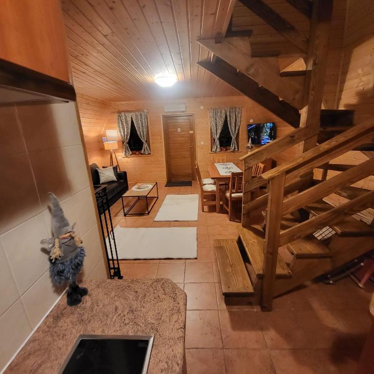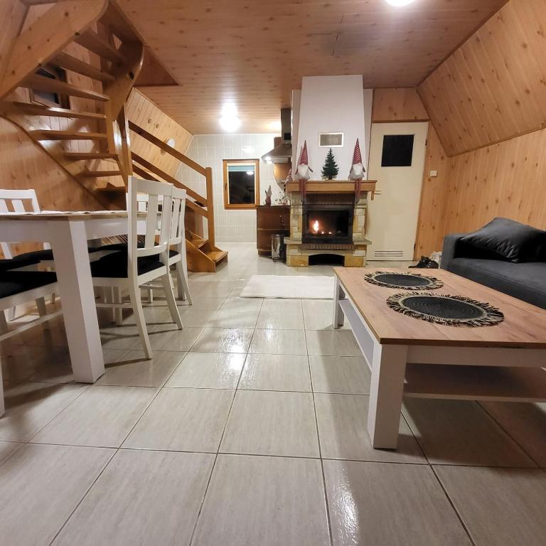 Na pierwszej kondygnacji znajduje się salon z kominkiem łazienka z prysznicem, oraz w pełni wyposażony aneks kuchenny. Druga kondygnacja zawiera dwie oddzielne sypialnie.